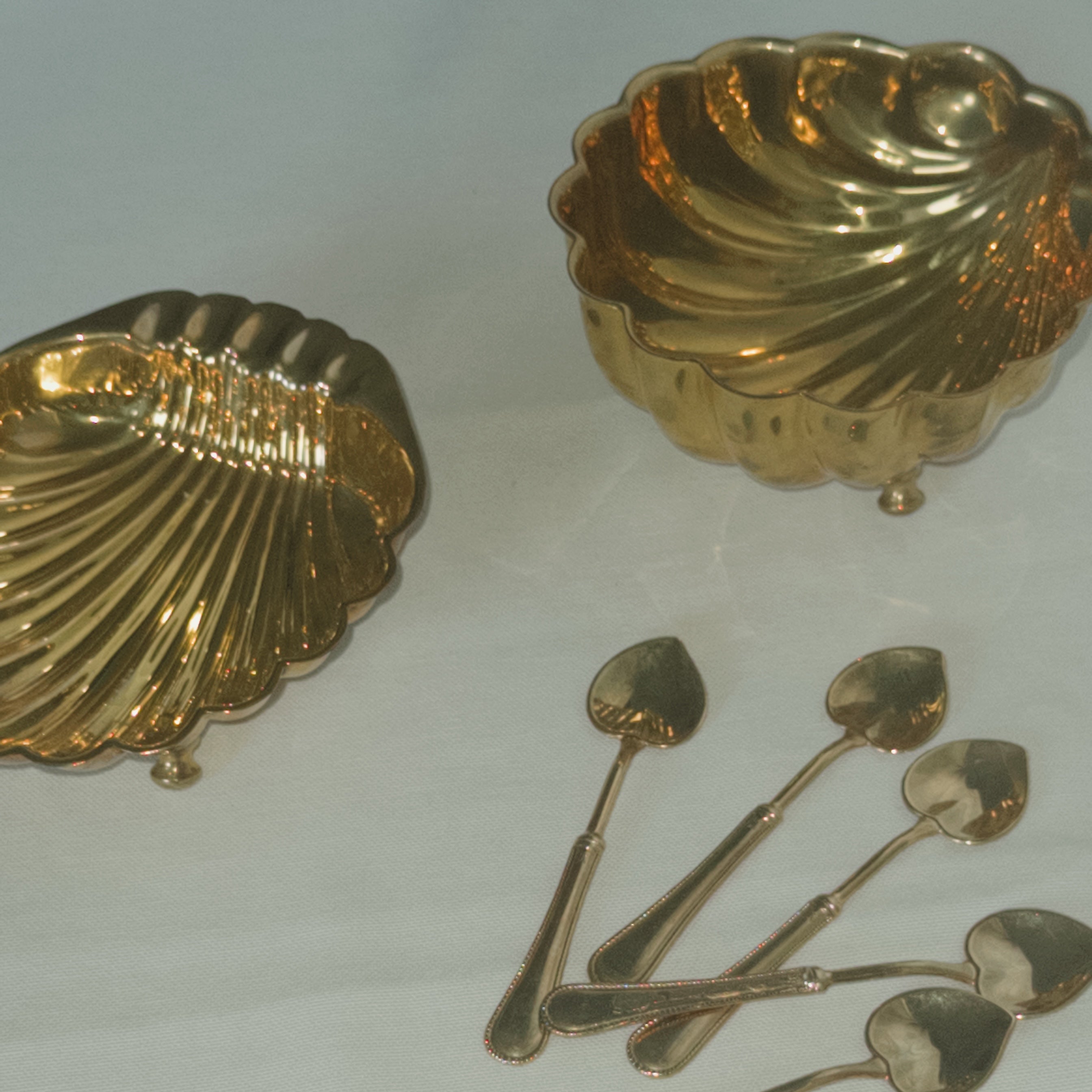 Vintage shell-shaped serving dish with glass insert and matching spoon.